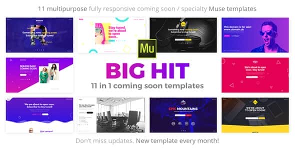 BigHit is a must have collection of responsive coming soon Adobe Muse templates for multipurpose use. Package included 11 fully responsive Muse templates ready for all devices. You can make professional coming soon website in a minutes without writing a code! Save your time and money, get BigHit pack now for special launch price. Don’t miss new responsive Muse templates in the next updates.