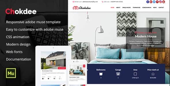 This responsive muse template is best suitable for real estate, single property, townhouse, single- house and condominium. The template is based on modern layout. It’s also can be used for any type of website. It is a clean and modern template. Chokdee template is responsive template. It’s build for Adobe Muse CC 2017.0.1.11 and above. You can edit each and every part of this template according to your needs.