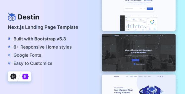 Destin is a Useful Next.js template and web elements for a hosting company. Modern colors, elegant curves, practical layout, and simple forms. It’s a powerful Easy to Use, Mobile friendly, Highly customizable SEO friendly template, built with the latest Bootstrap.