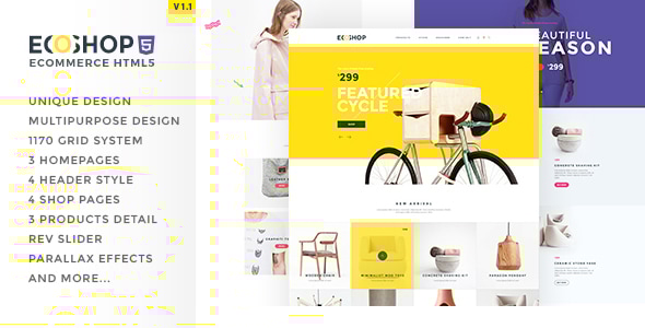ECOSHOP is high quality eCommerce HTML5 Templates which designed for commercial use like clothes, cosmetics, furniture, gadgets, shoes, bags, home decore etc. A ready HTML5 template to make a various online shop. Templates consists of HTML file. All layers are well organized and you can easily change its color, shapes etc.