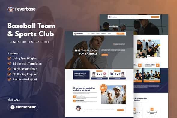 Feverbase is an Elementor Template Kit designed for Baseball Clubs and Sport Teams. Perfect for creating websites for baseball teams, sports clubs, coaching programs, or community events. It includes 15 professionally designed templates with a modern and dynamic style.