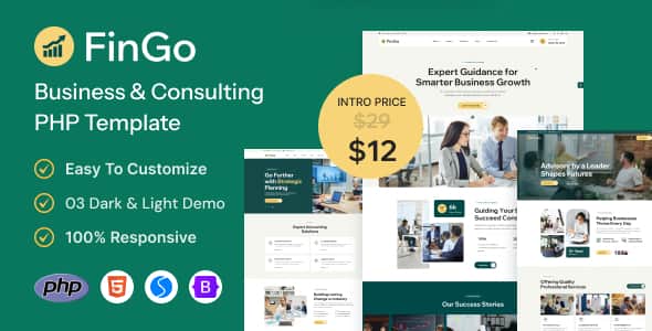 FinGo – Business Consulting PHP Template. Everything is in the documentation file so that you can change anything easily. It is a modern and clean design based on the Bootstrap 5 grid system, this template is a special design for Business Consulting and more websites you can build with this Template.