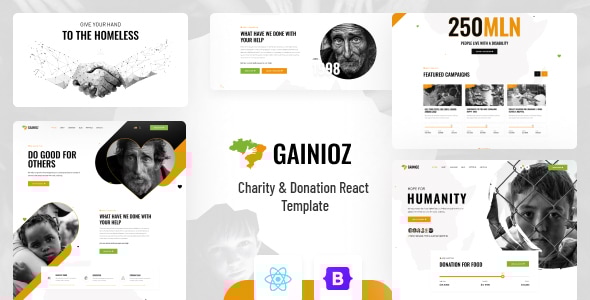 Gainioz – Charity & Donation React Template is built as a clean and modern responsive charity & fundraising multipurpose React Template. This Template is perfectly designed and organized for any kind of charity or any kind of fundraising site. You can easily modify and extend the Template layouts. Template included three clean homepage layouts with three different header styles and 14+ variant inner pages.