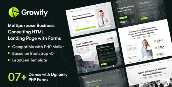 Growify – Multipurpose Business Consulting HTML Landing Page Template is a professional One Page business HTML landing page designed for Consulting Businesses, Consultants, Agencies, insurance and any kind of creative and corporate Business Companies. Growify has a uniquely modern and fully customizable layout, it’s based on Bootstrap 5. It has 4 Different layouts LeadGen, Click Through, Subscription, and Video Marketing Layouts. The layout is fully responsive on each responsive device. The forms are working in this template..