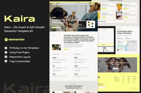 Kaira – Life Coach & Self-Growth Elementor Template Kit (NOT A WordPress Theme) is a beautifully crafted Elementor Template Kit designed for life coaches, mindset mentors, and self-growth guides who want to create a calming, elegant online presence that reflects their purpose. Whether you’re offering one-on-one sessions, online workshops, or mindfulness programs, Kaira gives you the perfect space to share your message and connect deeply with your audience.