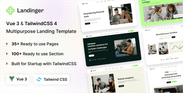 Landinger is a high-performance landing page template built with Vue 3x, using Tailwind CSS 4 for a clean, responsive design. It’s perfect for startups, SaaS, and digital products looking to launch fast with modern frontend technologies.