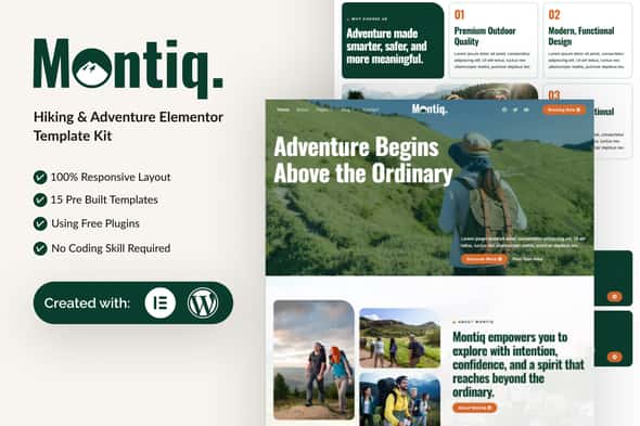 Montiq is a professional, modern and clean Elementor Template Kit designed for Hiking & Adventure. Built for WordPress, it seamlessly integrates with Elementor, enabling you to craft a professional website effortlessly—no coding skills required.