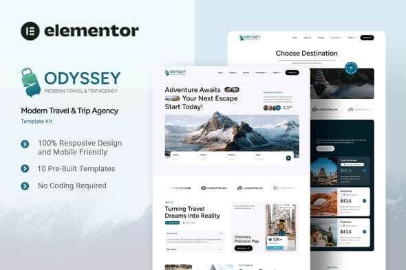 Odyssey is an Elementor Template Kit for quickly and easily creating a full website in WordPress for your business featuring a modern and professional design. The kit features a fully compatible design system and professionally hand-picked images for a premium, branded head-start on your next project. Optimized for use with the free Hello Elementor theme, this kit is fine-tuned, fast-loading and fully responsive.