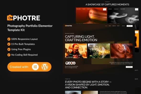 Photre is a professional, modern and clean Elementor Template Kit designed for Photography Portfolio Website. Built for WordPress, it seamlessly integrates with Elementor, enabling you to craft a professional website effortlessly—no coding skills required.