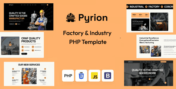 Pyrion – Factory & Industry PHP Template is a modern and professional design. You can use this template to develop your website for industries such as manufacturing, construction, engineering, and other industrial businesses. This PHP template is fully customizable, featuring three unique home page designs and many inner pages..