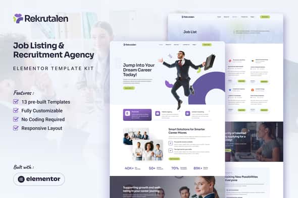 Rekrutalen is an Elementor Pro Template Kit designed for Job Listing & Recruitment Agency websites. It features a clean, modern, and professional layout that’s perfect for job portals, recruitment services, HR consulting, and talent acquisition platforms. The design is fully responsive and crafted to help agencies showcase job vacancies and connect candidates with employers seamlessly.