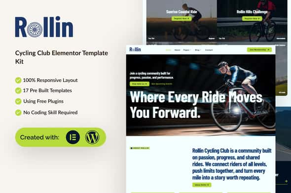 Rollin is a professional, modern and clean Elementor Template Kit designed for cycling tour, a corporate event with bike rentals, or any other bike-related gathering. Built for WordPress, it seamlessly integrates with Elementor, enabling you to craft a professional website effortlessly—no coding skills required.