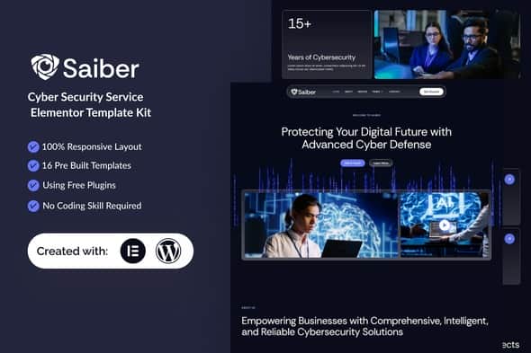 Saiber is a professional, modern, dark & Clean Elementor Template Kit designed for Cyber Security Service Website. Built for WordPress, it seamlessly integrates with Elementor, enabling you to craft a professional website effortlessly—no coding skills required.
