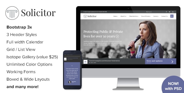 “Solicitor” is a full functional HTML5 Template designed & developed for Law Business, Lawyers, Legal websites and comes handy for any Corporate Business Websites as well. It is fully responsive template based on Twitter Bootstrap framework that makes it available for all screen sizes from the bigger ones to smartphones. Its not only responsive whereas it is retina ready also, now no blurry images on your HiDPI and retina devices.